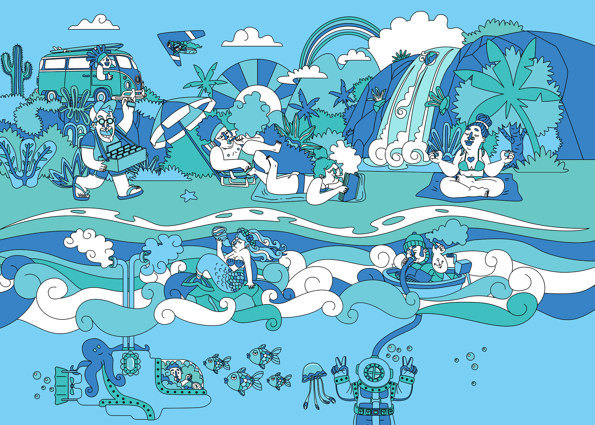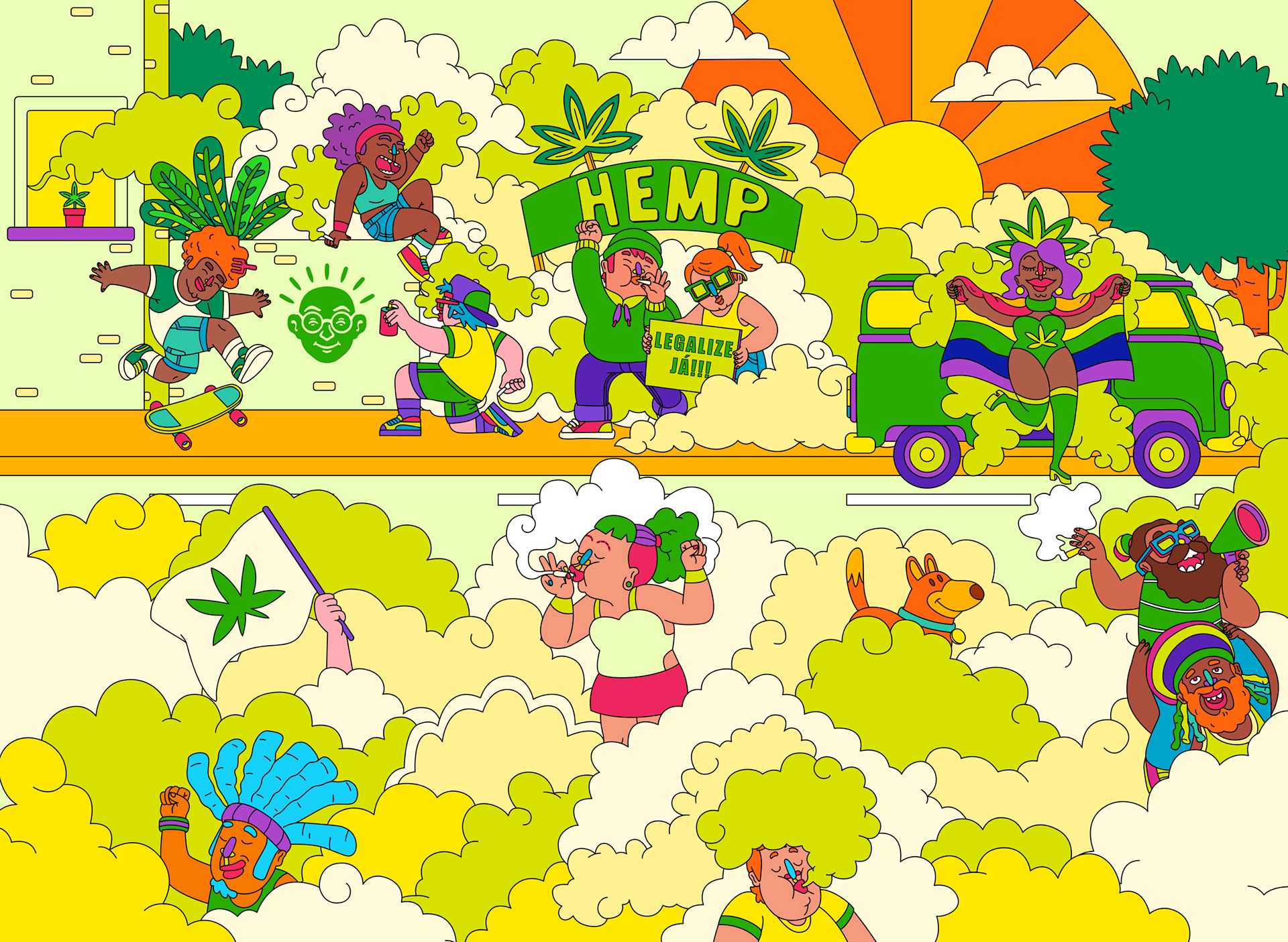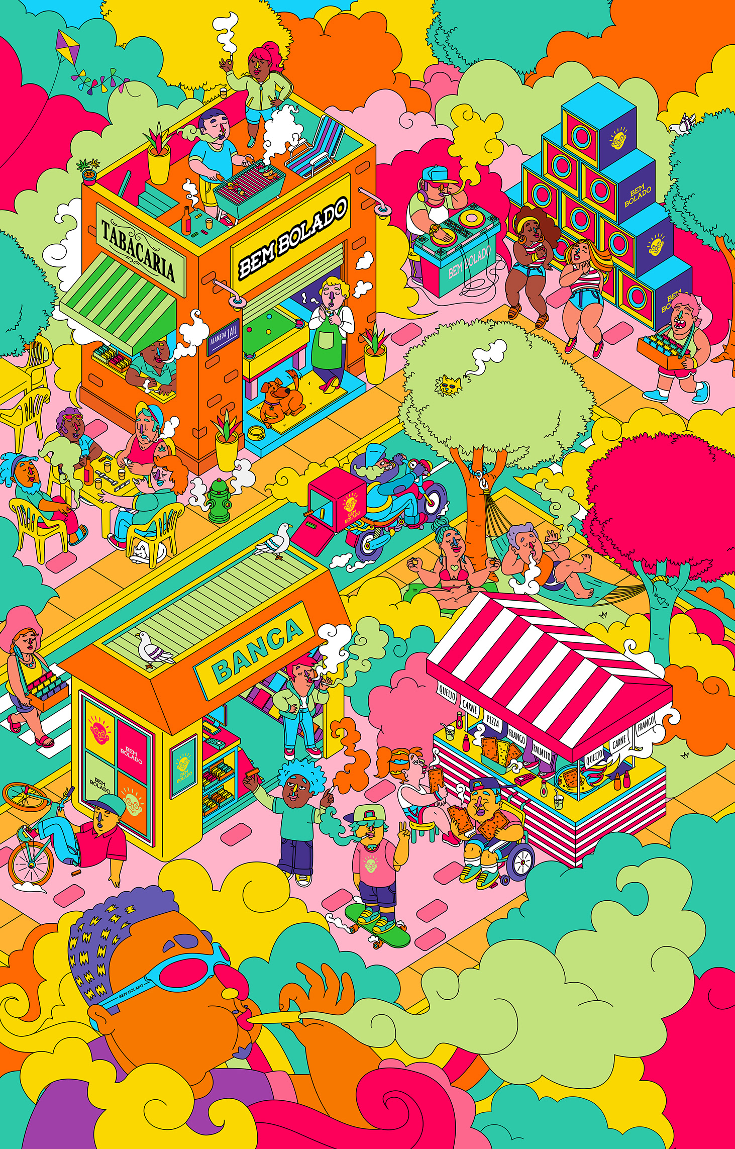 Colorful vector illustrations for the Bem Bolado product line.