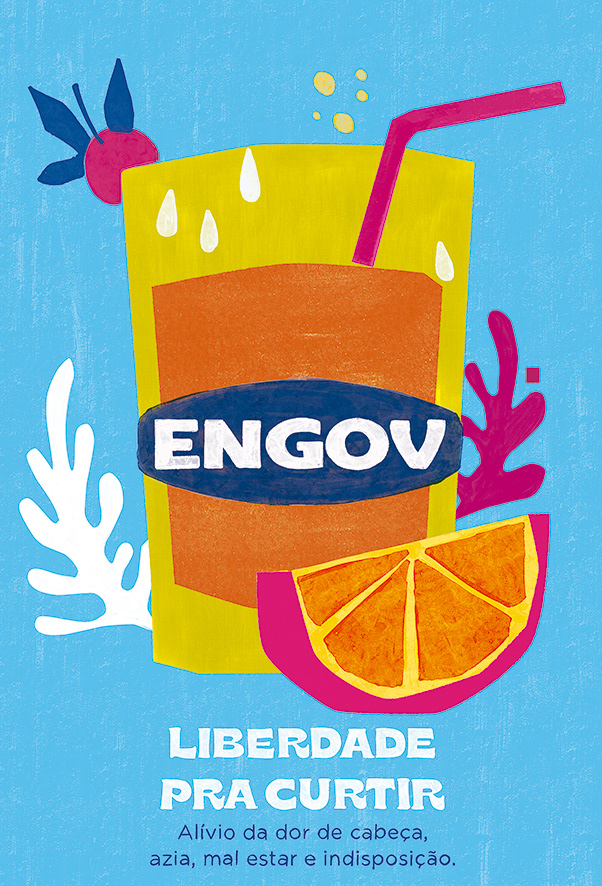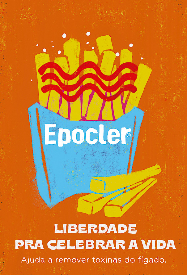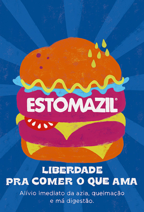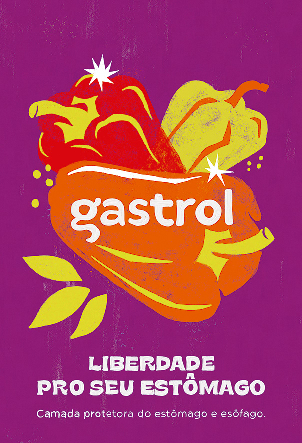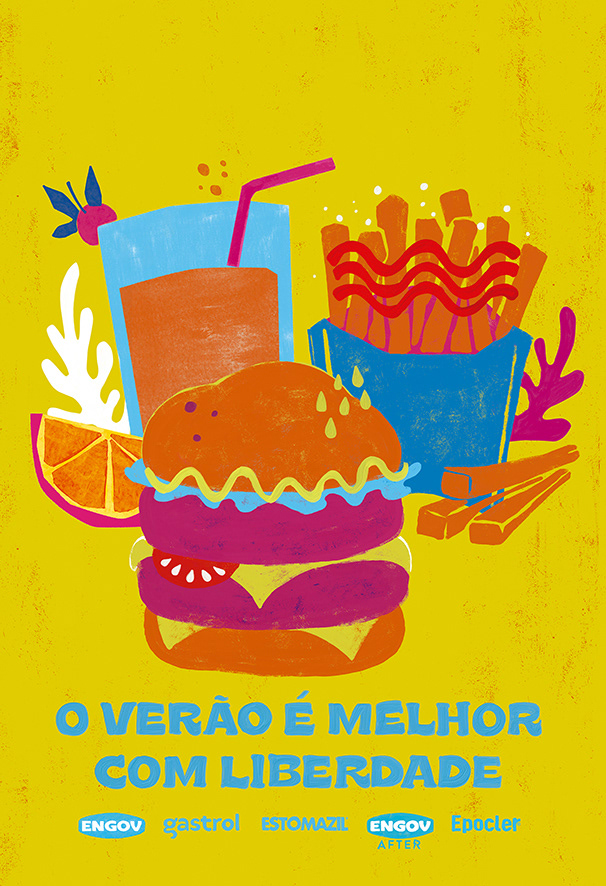 Digital illustrations of posters featuring foods that cause stomach discomfort, for a Hypera campaign.