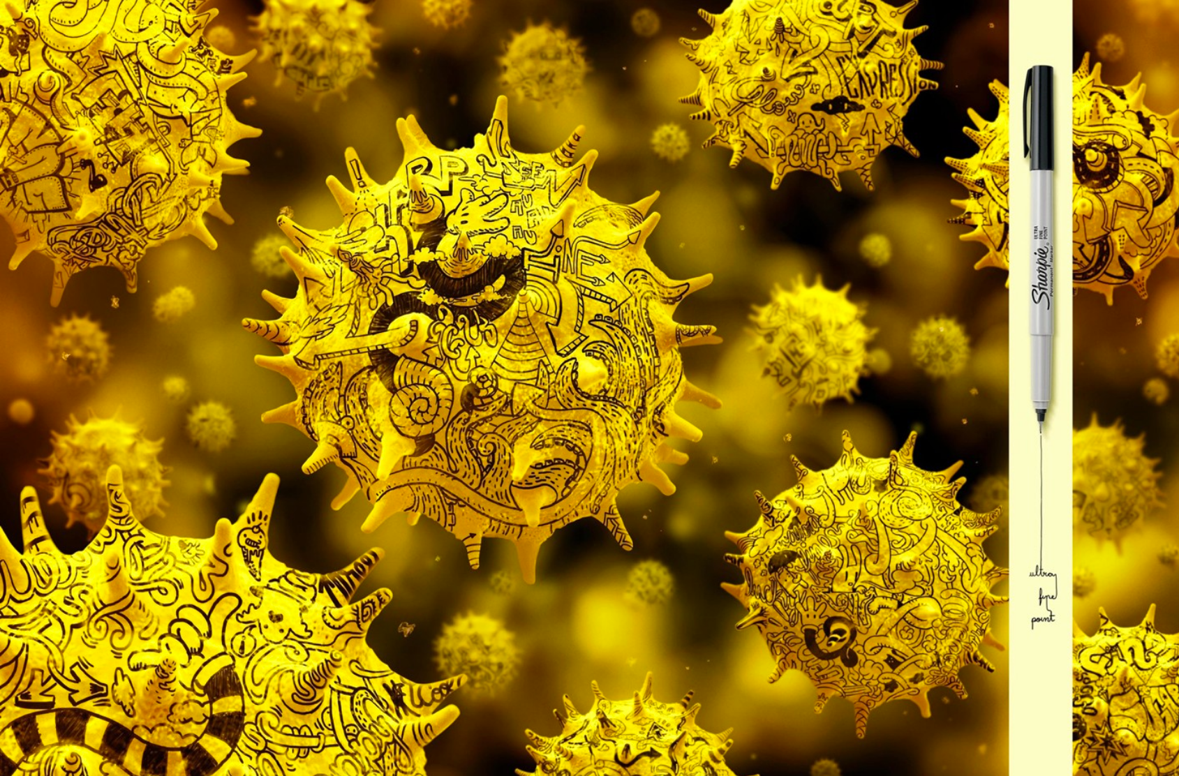 Hand-drawn doodle illustrations made with a fine sharpie pen, later disgitally applied to 3d illustrations of "bood cells"and "viruses".
